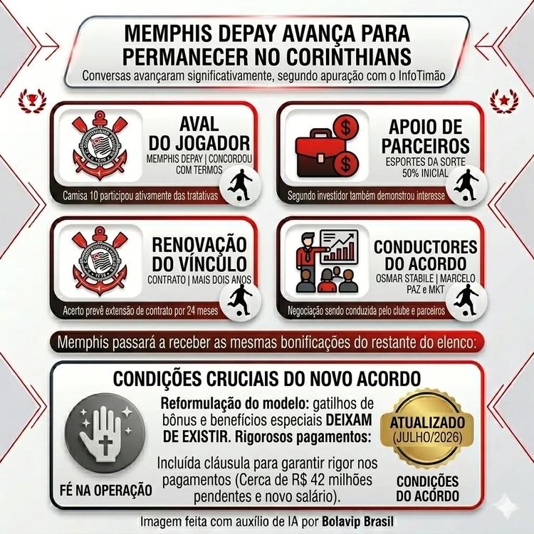 No novo acordo junto ao Timão, deixam de existir os gatilhos de bônus e benefícios especiais anteriormente previstos Uma nas “novelas” que mais estão chamando a atenção no Corinthians é possível renovação de Memphis Depay. De acordo com informações do jornalista Thiago Rodrigues, houve um avanço ext