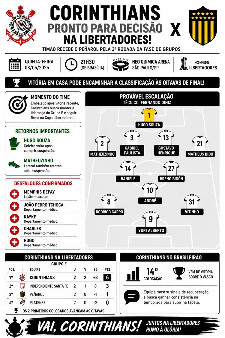 Na Libertadores, o Timão lidera o Grupo E com seis pontos. A equipe venceu Platense e Santa Fe nas duas primeiras rodadas. Já no Brasileirão, o cenário é de recuperação. O Corinthians ocupa a 14ª colocação, mas vem de vitória sobre o Vasco e tenta ganhar consistência na temporada.