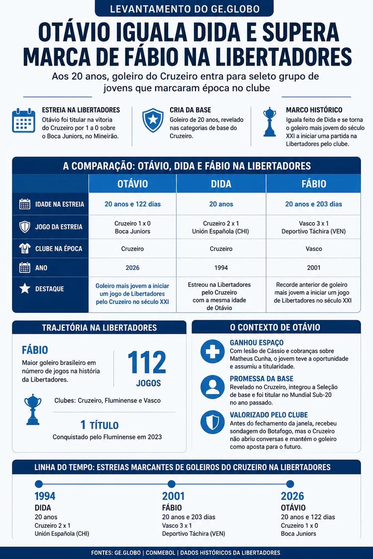Um levantamento do Ge.globo colocou um jovem nome do Cruzeiro lado a lado com dois dos maiores goleiros da história do clube de Minas Gerais. Aos 20 anos, Otávio não apenas repetiu um feito de Dida, como também superou uma marca que pertencia a Fábio na Libertadores.