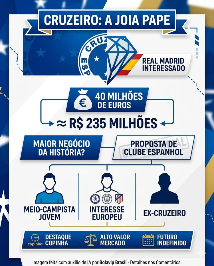 “Meia do Cruzeiro atrai interesse de Real, Chelsea e City após Sul-Americano. Eduardo Pape também atrai olhares de: Atlético de Madrid, Bournemouth, Monaco e Villarreal“, revelou o jornalista.