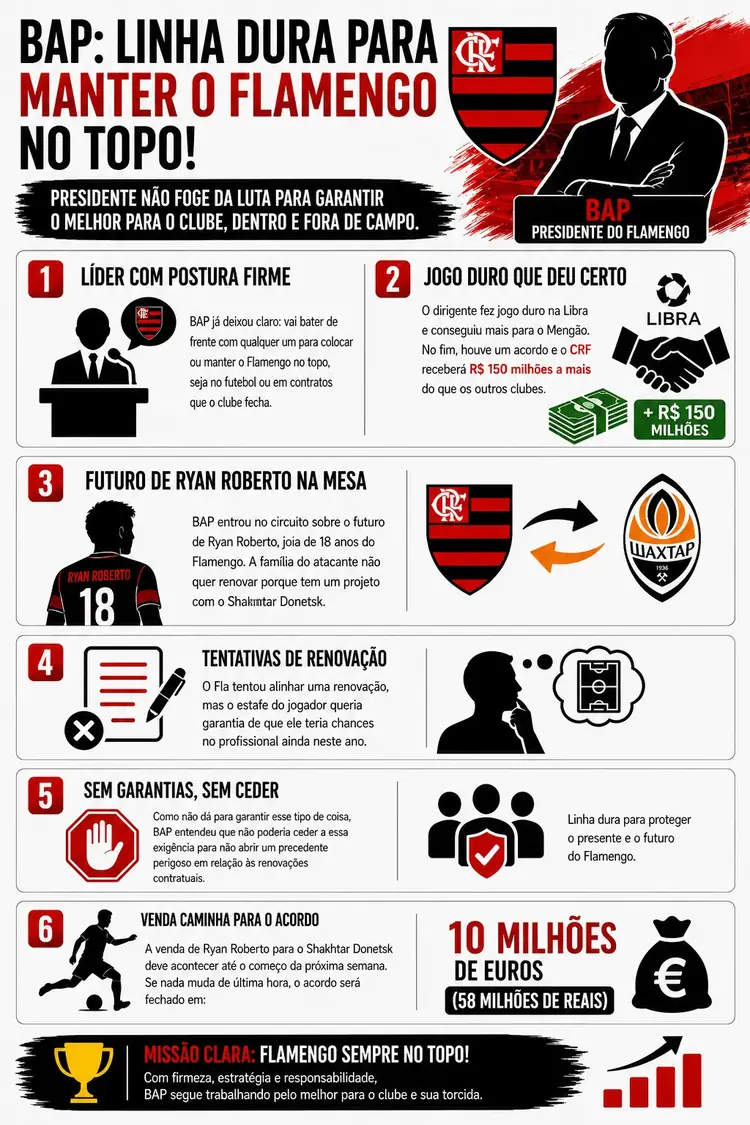 Presidente flamenguista tem sido linha dura nos bastidores para não ceder nas exigências impostas O presidente Bap já verbalizou diversas vezes que irá bater de frente com qualquer um para colocar ou manter o Flamengo no topo, seja no futebol ou também em contratos que o Clube fecha. Foi assim que