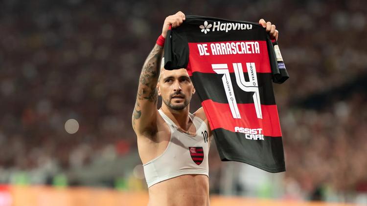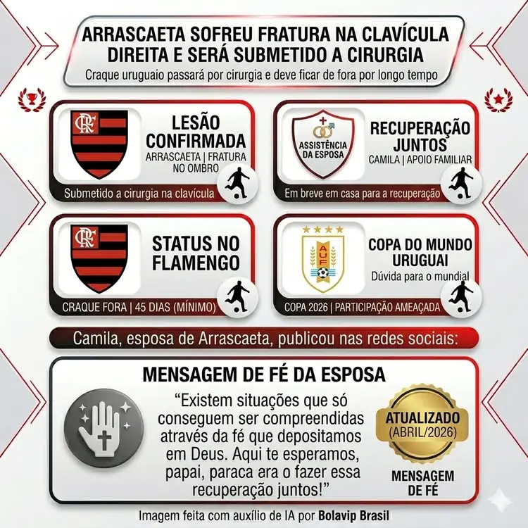 Nas redes sociais, Camila Bastiani manifestou apoio ao uruguaio, que deve ficar afastado dos gramados por, no mínimo, 45 dias No empate por 1 a 1 entre Estudiantes e Flamengo pela Libertadores, Arrascaeta sofreu uma fratura na clavícula direita e será submetido a cirurgia para correção nesta quinta-