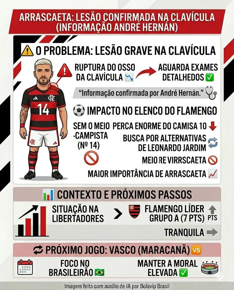 Segundo expôs André Hernán, Arrascaeta teve uma ruptura do osso da clavícula, e passará por exames mais detalhados nesta quinta-feira (30) para confirmar o seu tempo fora dos gramados.