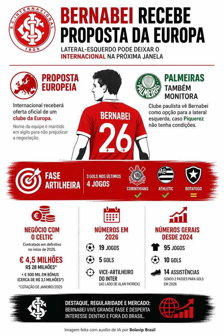 Na oportunidade, o Palmeiras acompanhou a negociação do Internacional com os escoceses. Na época emprestado pelo Celtic, Bernabei se destacou no segundo semestre de 2024, sob o comando de Roger Machado, quando foi eleito o melhor lateral-esquerdo do Brasileirão.