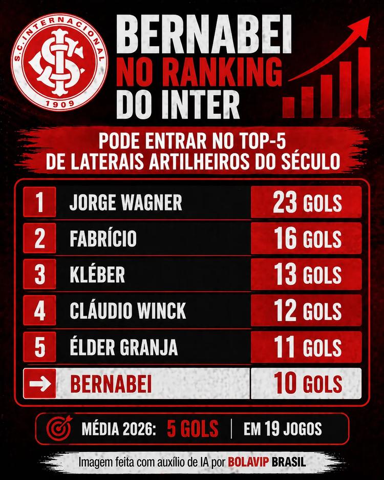 Dito isso, além de estar com a confiança elevada para ajudar o Internacional, Bernabei está perto de um feito histórico. De acordo com levantamento feito pelo portal GZH, ele está na beira do top-5 de laterais com mais gols pelo Inter no século.