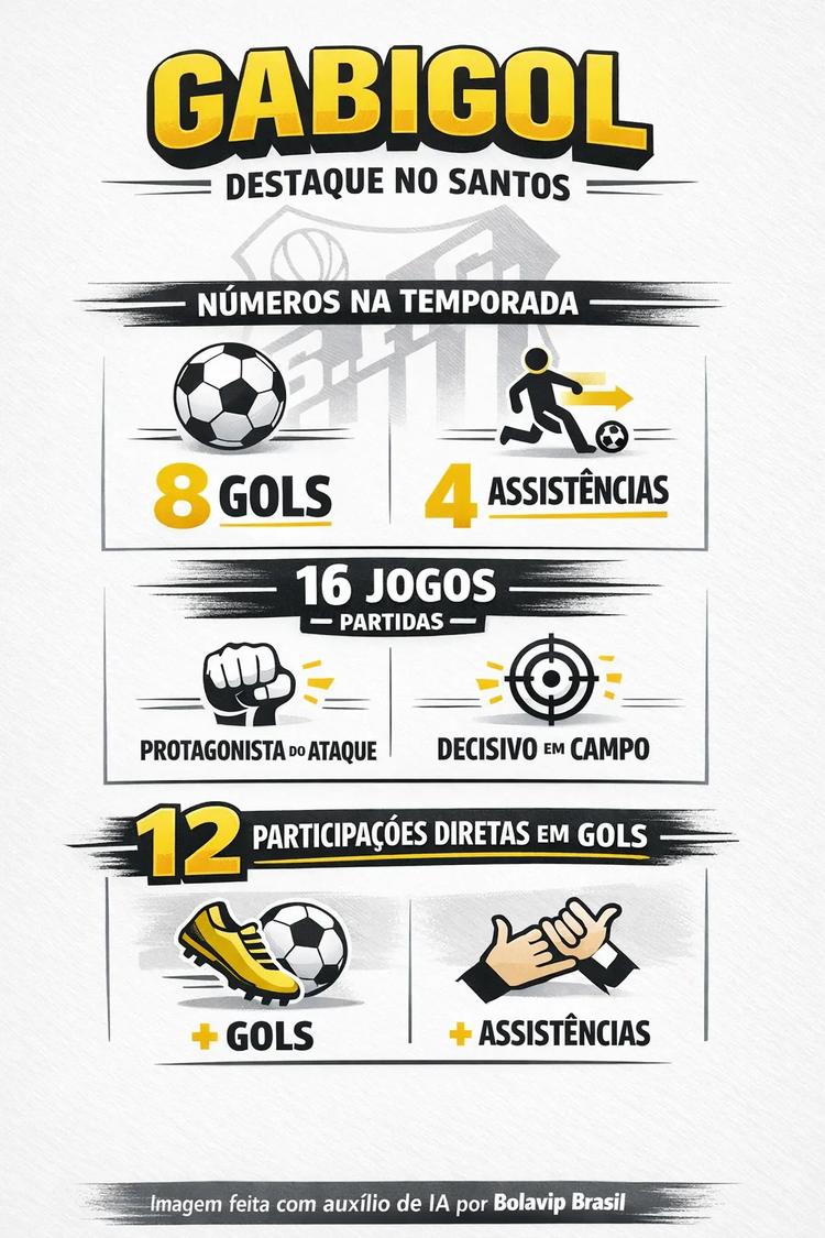 Protagonista do Santos na temporada, Gabigol lidera o Peixe em participações diretas. Com oito gols marcados e quatro assistências em 16 partidas, tem ajudado o time ofensivamente, assumindo o protagonismo em momentos importantes.