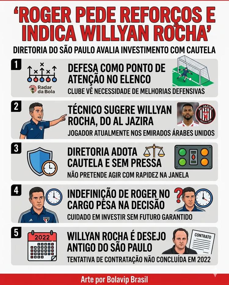 Segundo o perfil Radar da Bola, o São Paulo vê a defesa como um ponto que precisa de atenção no elenco. O técnico Roger Machado, inclusive, já sugeriu o nome do zagueiro Willyan Rocha, que atua no Al Jazira.