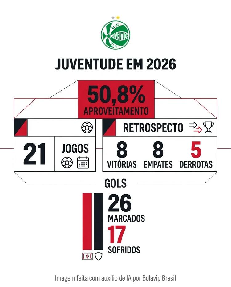 Segundo dados do SofaScore e do Lance!, ao longo de 2026, o time gaúcho soma oito vitórias, oito empates e cinco derrotas em 21 jogos, com aproveitamento de 50,8%. A equipe marcou 26 gols e sofreu 17, além de manter posse de bola próxima dos 50% e média de cerca de 11 finalizações por partida.